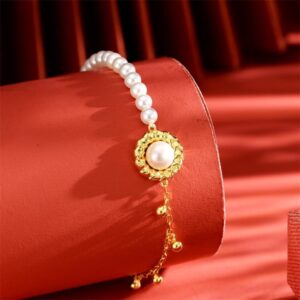 A close-up of the gold-toned Dragon Scale Pearl Bracelet showcases its detailed craftsmanship. The dragon scale charm, central pearl, and dangling gold beads are clearly visible, emphasizing the piece’s intricate design. The red backdrop enhances the bracelet’s luxurious feel, making it a standout accessory for special occasions.