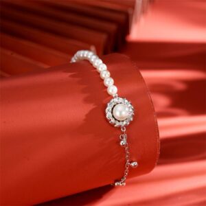 The silver-toned Dragon Scale Pearl Bracelet is highlighted in a close-up, featuring a dragon scale charm, central pearl, and dangling silver beads. The sleek, platinum-toned finish and the pearls’ natural luster create an elegant contrast, perfect for those who prefer a more understated yet sophisticated style.