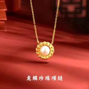 This image showcases the Dragon Scale Pearl Necklace, a stunning piece crafted in a gold-toned finish. The necklace features a central pearl encased in an intricately designed dragon scale-inspired charm, symbolizing power and prosperity in Chinese culture. Suspended from a delicate gold chain, the pendant is set against a rich red backdrop, enhancing its luxurious appeal. The Chinese name emphasizes the fusion of traditional dragon symbolism and timeless pearl elegance, making it a standout accessory for those who appreciate cultural heritage in jewelry.