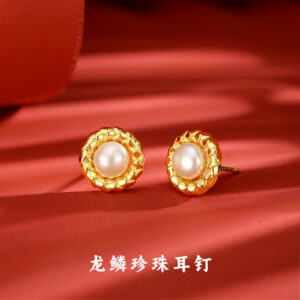 The Dragon Scale Pearl Earrings mirror the necklace’s design, featuring pearls set in gold-toned dragon scale charms. These stud earrings are displayed against a matching red backdrop, highlighting their symmetry and detailed craftsmanship. The Chinese name reinforces the collection’s thematic cohesion, offering a coordinated look that blends cultural significance with classic pearl beauty.