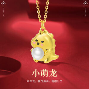 Introducing the Cute Dragon Pendant Necklace, a whimsical piece featuring a golden, cartoon-style dragon holding a pearl. The dragon’s adorable expression and rounded shape add a playful touch, while the red backdrop and Chinese text (Little Cute Dragon) emphasize its role as a lucky charm for the Year of the Dragon. The caption (Zodiac Dragon, Full of Blessings, Playful and Charming) positions it as a festive, heartwarming accessory.