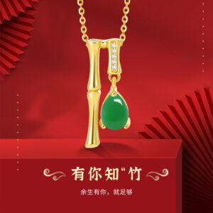 The Bamboo & Chalcedony Necklace features a gold-toned bamboo stalk charm with a dangling green chalcedony teardrop, symbolizing growth and resilience. Accented with small cubic zirconia stones, the pendant hangs from a delicate chain against a red background. The Chinese name (With You, Know ‘Bamboo’) and caption (Having You for the Rest of My Life is Enough) infuse it with romantic and symbolic meaning, perfect for expressing enduring affection.