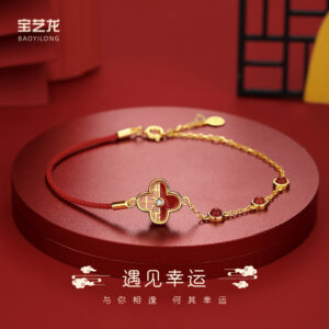 This image presents the Four-Leaf Clover Red Cord Bracelet by Baoyilong. The bracelet combines a red cord with a gold-toned four-leaf clover charm (inlaid with red agate and a small stone), symbolizing luck. Additional red agate beads and a gold chain extension add detail, while the red backdrop and Chinese text (Meet Luck) reinforce its role as a fortune-bringing accessory.