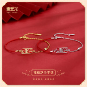 The “Fortune & Prosperity” Red Cord Bracelet comes in gold and silver finishes, each featuring a rectangular charm with intricate cut-out patterns symbolizing good fortune. The red cord and chain extension ensure a comfortable fit, while the red backdrop and Chinese text (Fortune & Prosperity Bracelet) highlight its cultural significance as a lucky charm.