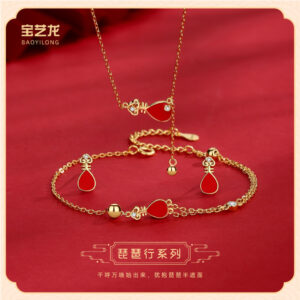 The Pipa Series Jewelry Set by Baoyilong includes a necklace, bracelet, and earrings, all inspired by the traditional Chinese pipa instrument. The gold-toned pieces feature red enamel pipa charms with cubic zirconia accents, set against a red background. The Chinese name (Pipa Journey Series) and poetic caption (After Much Urging, She Finally Appears, Half-Hiding Behind the Pipa) celebrate classical Chinese artistry.