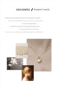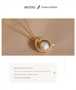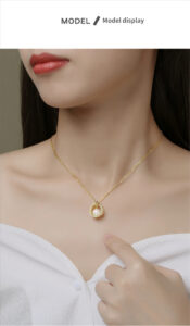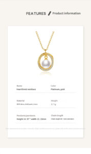 A close-up of the gold-toned Heartthrob Necklace highlights the quality of the shell pearl: “Made of high-quality mother-of-pearl beads. These beads require multiple advanced processes to produce, featuring pure color that does not fade or change. They are easy to maintain and emit a dazzling luster.” The intricate zircon setting and polished gold finish are also emphasized, showcasing the craftsmanship.