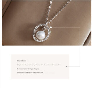 The platinum-toned Heartthrob Necklace is detailed, with focus on the S925 silver material: “Solid S925 silver—brightness and luster close to platinum, with better hardness than pure silver. It is corrosion-resistant and hypoallergenic, safe even for sensitive skin.” The zircon encrustation and polished silver finish highlight the piece’s refined elegance.