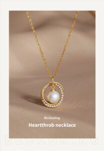 This image features the Heartthrob Necklace by Baoyilong, crafted in a luxurious gold tone. The necklace showcases a luminous shell pearl suspended within an intricately designed circular pendant, encrusted with sparkling zircon stones. Suspended from a delicate gold chain, the pendant is set against a soft, neutral backdrop that highlights its elegant details. The text “Beckoning Heartthrob necklace” emphasizes its alluring design, making it a perfect accessory for those who appreciate a blend of classic pearl beauty and modern, glamorous detailing.