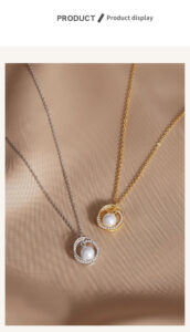 The necklace’s multi-layer plating technology is highlighted: “S925 silver plated with white gold and K-gold, thicker than ordinary plating. It is colorfast, with superior texture, and features a fashionable, elegant color that is shiny, refined, and enhances your look.” The comparison between gold and platinum finishes underscores the durability and aesthetic quality of the plating.