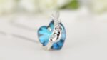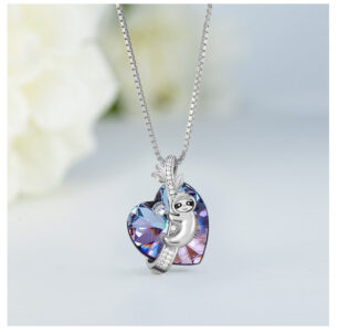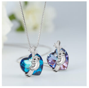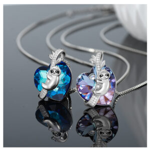 The Sloth Heart Necklace is displayed on a reflective black surface, showcasing both the blue and purple colorways. The reflective background accentuates the crystals’ luminosity and the silver sloth charms’ polished finish. This presentation highlights the necklaces’ ability to catch light and create a captivating visual effect, emphasizing their craftsmanship and elegant design.
