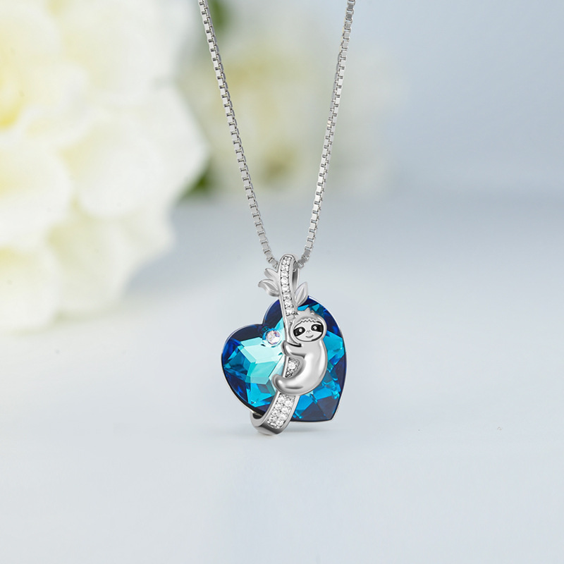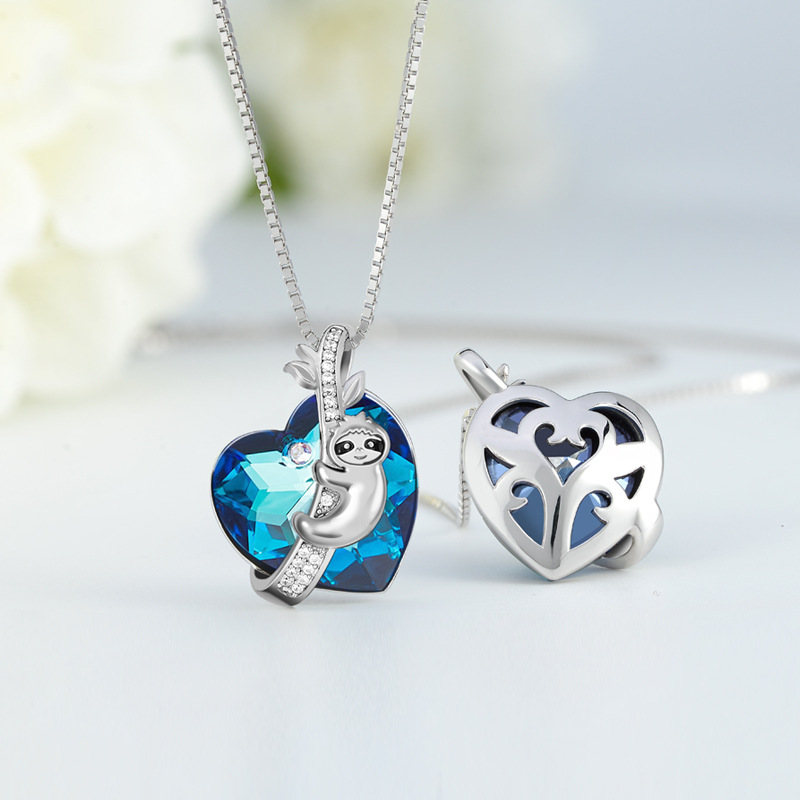 The blue Sloth Heart Necklace is displayed against a soft, light backdrop with floral accents. The necklace features a vibrant blue heart crystal, a silver sloth charm, and a delicate box chain, emphasizing its elegant yet playful design.