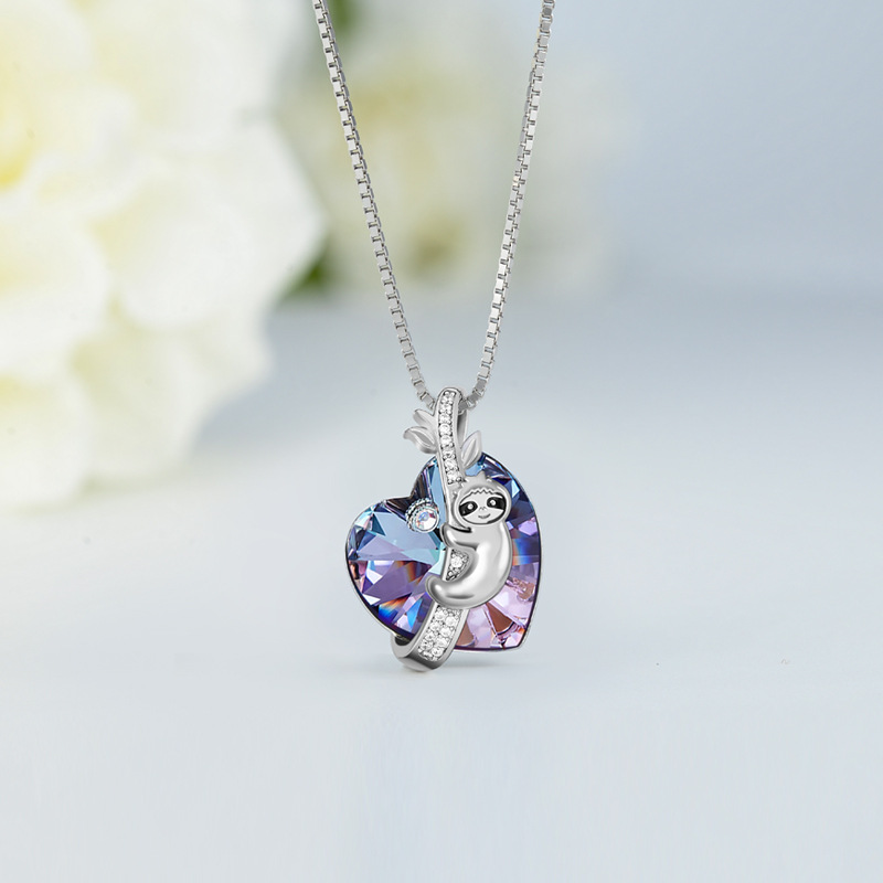 The purple Sloth Heart Necklace is showcased against a soft, light backdrop. The iridescent heart crystal shifts between shades of purple and blue, while the silver sloth charm and box chain maintain a refined look. This image emphasizes the necklace’s unique color play and intricate detailing.