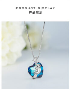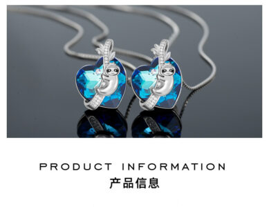 This image focuses on the blue Sloth Heart Necklace, showcasing its design on a reflective black backdrop. The text “PRODUCT INFORMATION” indicates a deep dive into specifications, emphasizing the necklace’s cohesive aesthetic and craftsmanship.