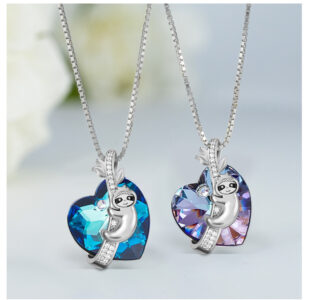 Both the blue and purple Sloth Heart Necklaces are displayed together, highlighting their contrasting aesthetics. The blue version offers a bold, vibrant look, while the purple version features an iridescent, multi-hued crystal. This side-by-side presentation allows customers to compare and choose their preferred style.