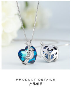This image focuses on the Sloth Heart Necklace’s detailed craftsmanship, including a view of the pendant’s back. The front features a blue heart crystal and silver sloth charm, while the back reveals an intricate cut-out design that complements the front’s aesthetic. The text “PRODUCT DETAILS” underscores the attention to detail in both the front and back of the pendant, showcasing the brand’s commitment to quality and design cohesion.