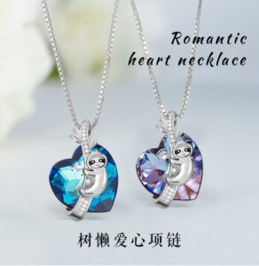 The Sloth Heart Necklace collection is presented in two colorways: vibrant blue and iridescent purple. Each necklace features a heart-shaped crystal pendant with a detailed silver-toned sloth charm, set against a soft, light backdrop. The text “Romantic heart necklace” and its Chinese counterpart emphasize the design’s blend of whimsy and romance, making it ideal for those who love nature-inspired, playful jewelry.