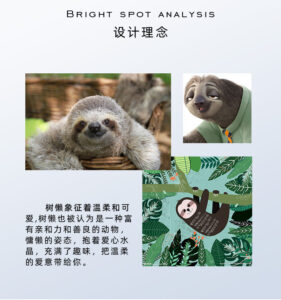 The design draws inspiration from sloths, symbolizing gentleness, cuteness, and kindness. The text explains: “Sloths represent tenderness and adorableness, seen as approachable and kind animals. Their lazy posture, paired with a heart-shaped crystal, is full of charm, bringing gentle love to you.” Visuals of real sloths and illustrated designs reinforce the nature-inspired, affectionate theme.