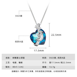 This image showcases the Sloth Heart Crystal Necklace, a whimsical piece featuring a vibrant blue heart-shaped crystal pendant. Adorning the crystal is a detailed silver-toned sloth charm, clinging to a branch-like element encrusted with sparkling zircon stones. Set against a soft, neutral backdrop with blurred floral accents, the necklace highlights the crystal’s multi-faceted shine and the sloth’s intricate detailing. This design blends playful charm with elegant craftsmanship, making it an ideal accessory for those who appreciate nature-inspired jewelry with a touch of whimsy. The combination of the heart crystal and the adorable sloth creates a unique and eye-catching piece, perfect for adding a playful yet sophisticated touch to any outfit.