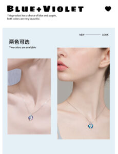 The Sloth Heart Necklace is available in two colors: blue and purple. Models showcase each version, highlighting how the crystals complement different skin tones and styles. The text “Blue + Violet” and “Two colors are available” emphasize versatility, allowing customers to choose based on personal preference.