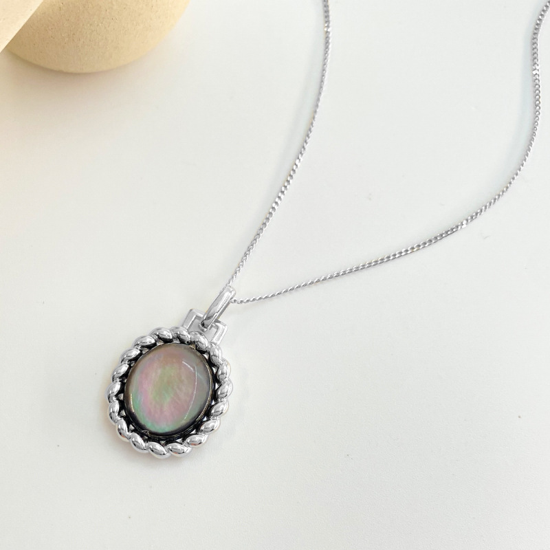The platinum-toned Iridescent Shell Pendant Necklace is showcased against a light backdrop. The silver-toned metal and abalone shell create a sleek, modern look, with the text (Fashionable, Elegant, Romantic, and Exquisite) emphasizing its aesthetic appeal. The pendant’s intricate rope detailing and the shell’s multi-hued shine are clearly visible.