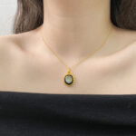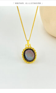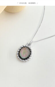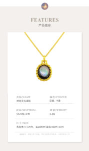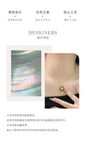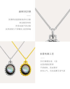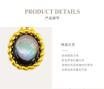 A close-up of the abalone shell pendant in the gold-toned version highlights its quality: “Selected Shell – Uses carefully chosen shells with a smooth texture and shining luster, making each piece uniquely beautiful and embodying a noble and elegant temperament.” The intricate rope-edged frame and the shell’s multi-faceted shine are emphasized.