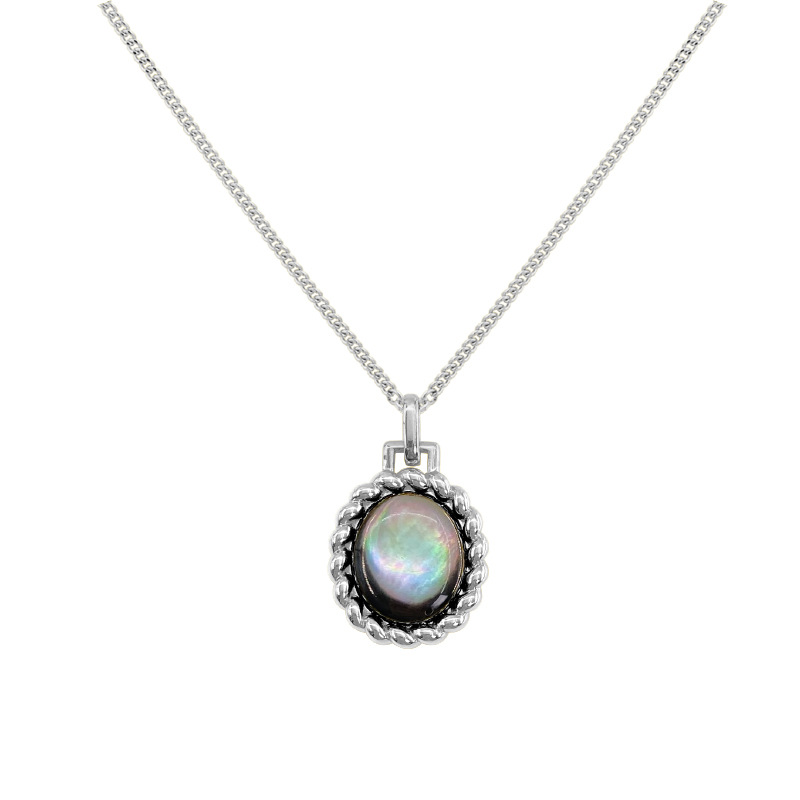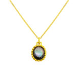 The necklace is displayed in two colorways: gold-toned and platinum-toned. Both feature the same abalone shell pendant with a rope-edged frame, highlighting the design’s versatility. The neutral backdrop ensures the focus remains on the necklace’s details, from the shell’s iridescence to the metal’s polished finish.