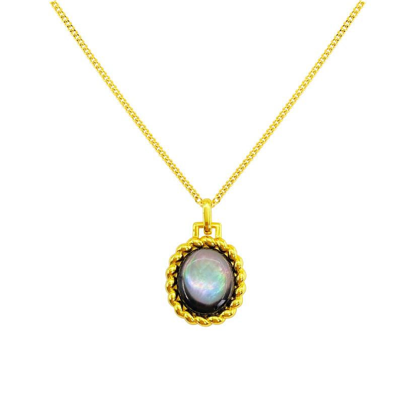 This image features the Iridescent Shell Pendant Necklace by Baoyilong. The necklace showcases an oval abalone shell pendant with iridescent hues, encircled by an intricate gold-toned rope-edged frame. Suspended from a delicate gold chain, the pendant is set against a clean, neutral backdrop, with a textured ceramic object adding subtle depth. The text “FASHIONABLE SHELL” and its Chinese counterpart highlight the design’s focus on trendy, nature-inspired elegance. The brand name “Baoyilong” reinforces its identity as a piece of refined jewelry.