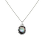 The platinum-toned necklace is displayed on a model in a light-colored top. The silver-toned metal and abalone shell create a subtle, elegant look, with the text “THE WIZARD OF OZ” adding a whimsical touch. A close-up of the abalone shell’s iridescence reinforces the natural beauty of the material.