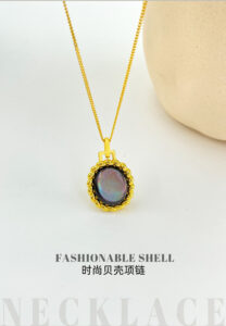 This image features the Gilded Shell Pendant Necklace by Baoyilong. The necklace showcases an oval abalone shell pendant with iridescent hues, encircled by an intricate gold-toned rope-edged frame. Suspended from a delicate gold chain, the pendant is set against a clean, neutral backdrop, with a textured ceramic object adding subtle depth. The text “FASHIONABLE SHELL” and its Chinese counterpart highlight the design’s focus on trendy, nature-inspired elegance. The brand name “Baoyilong” reinforces its identity as a piece of refined jewelry, ideal for those seeking to incorporate a touch of sophisticated, bohemian charm into their wardrobe.