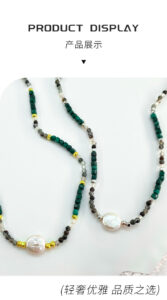 The necklace is showcased in two colorways: one with golden accents and the other with silver accents. Both feature the Baroque pearl and malachite bead arrangement, highlighting versatility. The text (Light Luxury Elegance, Quality Choice) underscores its sophisticated appeal.