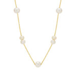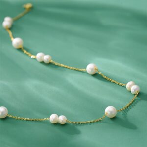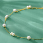 This angle focuses on the necklace’s clasp and chain detailing. The secure clasp and fine chain construction ensure durability, while the pearls’ consistent luster speaks to their quality. The gold finish, resistant to tarnishing, promises long-lasting shine, making it a reliable addition to any jewelry collection.