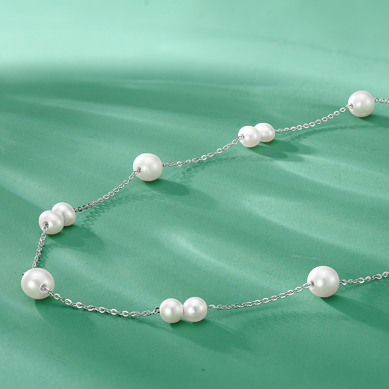 The necklace is showcased in a silver colorway against a teal satin backdrop. The silver chain, paired with lustrous white pearls, exudes a sleek, modern elegance. This variant highlights the design’s versatility, proving it complements both warm and cool-toned styles. The pearls’ natural luster and the chain’s polished finish underscore the piece’s refined aesthetic.