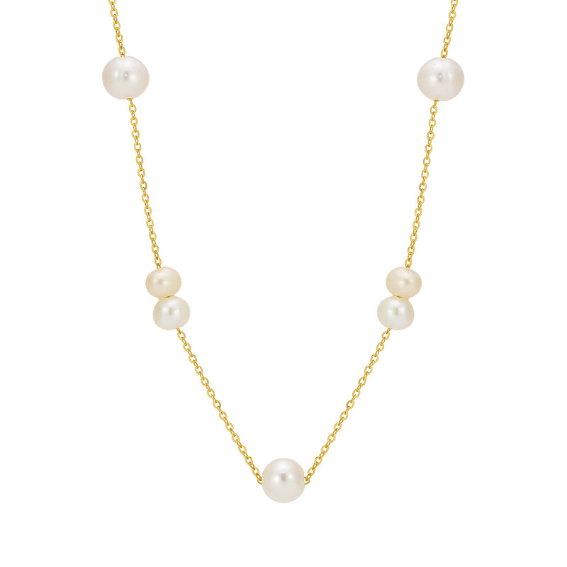 Another angle of the gold colorway showcases the necklace’s fluidity and wearability. The pearls are strategically placed to draw the eye, while the fine chain ensures a comfortable fit. This view highlights the design’s balance of classic pearl elements and contemporary minimalism, suitable for everyday wear or special occasions.