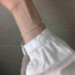 Styled on a wrist next to a pink rose, this classic pearl tennis bracelet exudes vintage glamour. The uniform, round pearls create a timeless look, reminiscent of old Hollywood elegance. Paired with a soft, light-colored outfit, it’s a sophisticated accessory for formal or special occasions.
