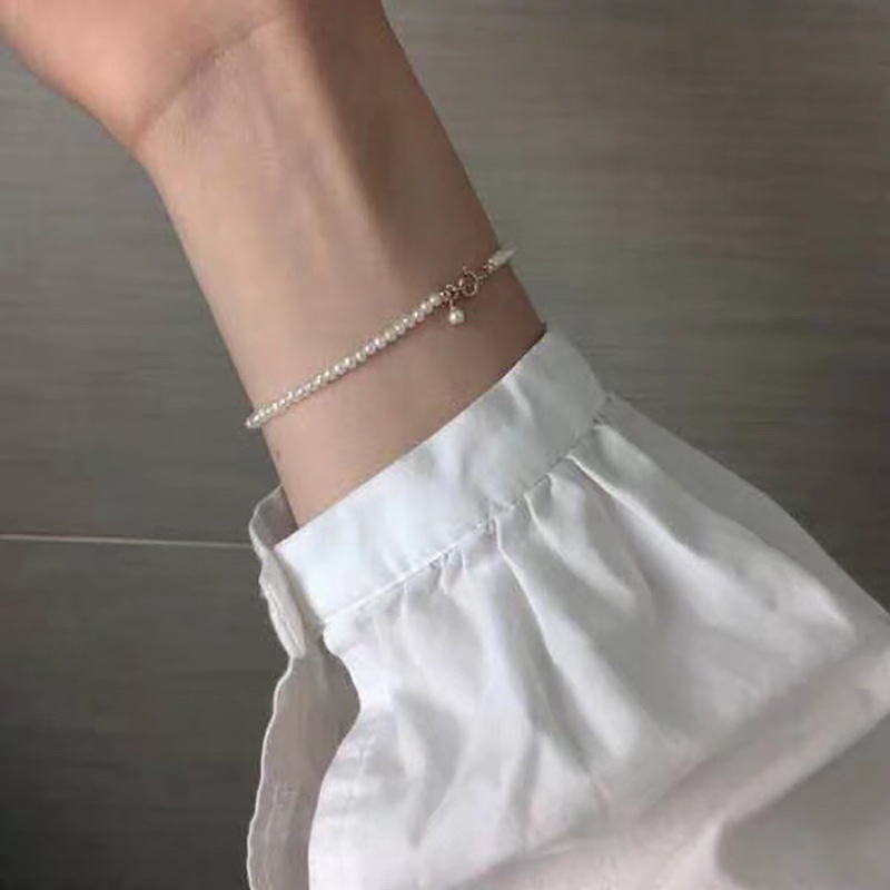 Styled on a wrist with a checkered sleeve, this dainty pearl & gold charm bracelet blends minimalism and sophistication. The tiny pearl strand is accented by a gold charm and adjustable chain, creating a versatile piece that pairs well with both casual and tailored outfits, ideal for adding a subtle touch of luxury to daily wear.