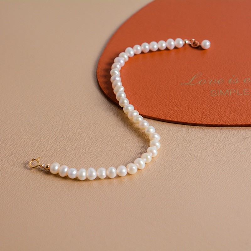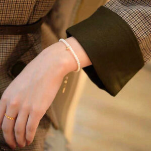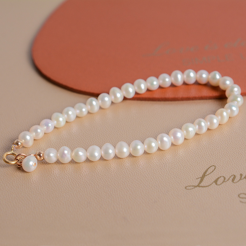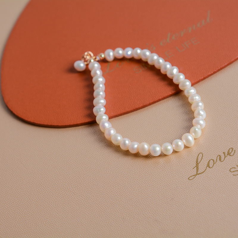 This image showcases the Minimalist Freshwater Pearl Bracelet, a refined piece featuring lustrous natural freshwater pearls strung together with delicate 14K gold-filled accents. Displayed against a warm-toned backdrop with the text “Love is eternal” and (Natural Freshwater Pearl)”, the bracelet exudes a sense of (light luxury) elegance and timeless charm. The uniform yet subtly varied pearls create a minimalist yet sophisticated look, perfect for everyday wear or adding a touch of grace to office attire. Ideal for those who appreciate understated, handcrafted jewelry, this bracelet balances simplicity and refinement, making it a versatile accessory for any occasion.