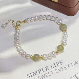 This image showcases the Hetian Jade & Pearl Bracelet, a sophisticated piece featuring lustrous natural freshwater pearls and smooth Hetian jade beads, accented with 14K gold-filled details. Set against a soft, neutral backdrop with the text “SIMPLE LIFE”, the bracelet exudes a sense of (Neo-Chinese) elegance and  (light luxury) charm. The combination of pearls and jade creates a balanced look of tradition and modernity, perfect for elevating both casual and formal outfits.