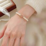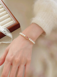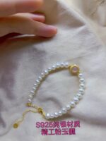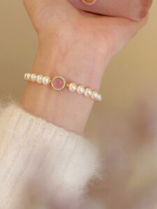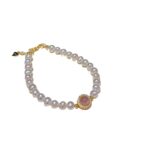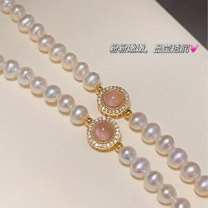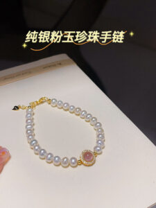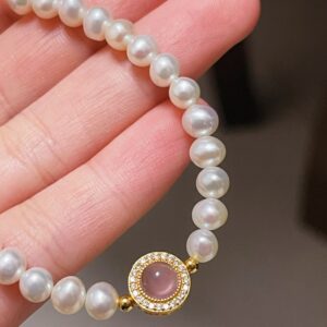 Showcased here is the S925 Silver Pink Agate Pearl Bracelet with a gold-toned finish. It features lustrous natural freshwater pearls and a central pink agate stone encircled by sparkling accents. Placed on a light-colored surface, the bracelet exudes a sense of (light luxury) charm, perfect for elevating both casual and formal outfits.