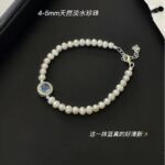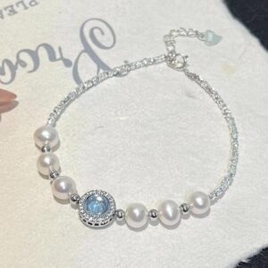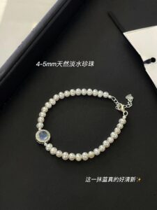 This image features the S925 Silver Blue Agate Pearl Bracelet, crafted with 4-5mm natural freshwater pearls and a central blue agate stone. Set against a black backdrop, the bracelet’s silver-toned details and the agate’s fresh blue hue create a sophisticated contrast, making it a standout accessory for those seeking a blend of elegance and trendiness.