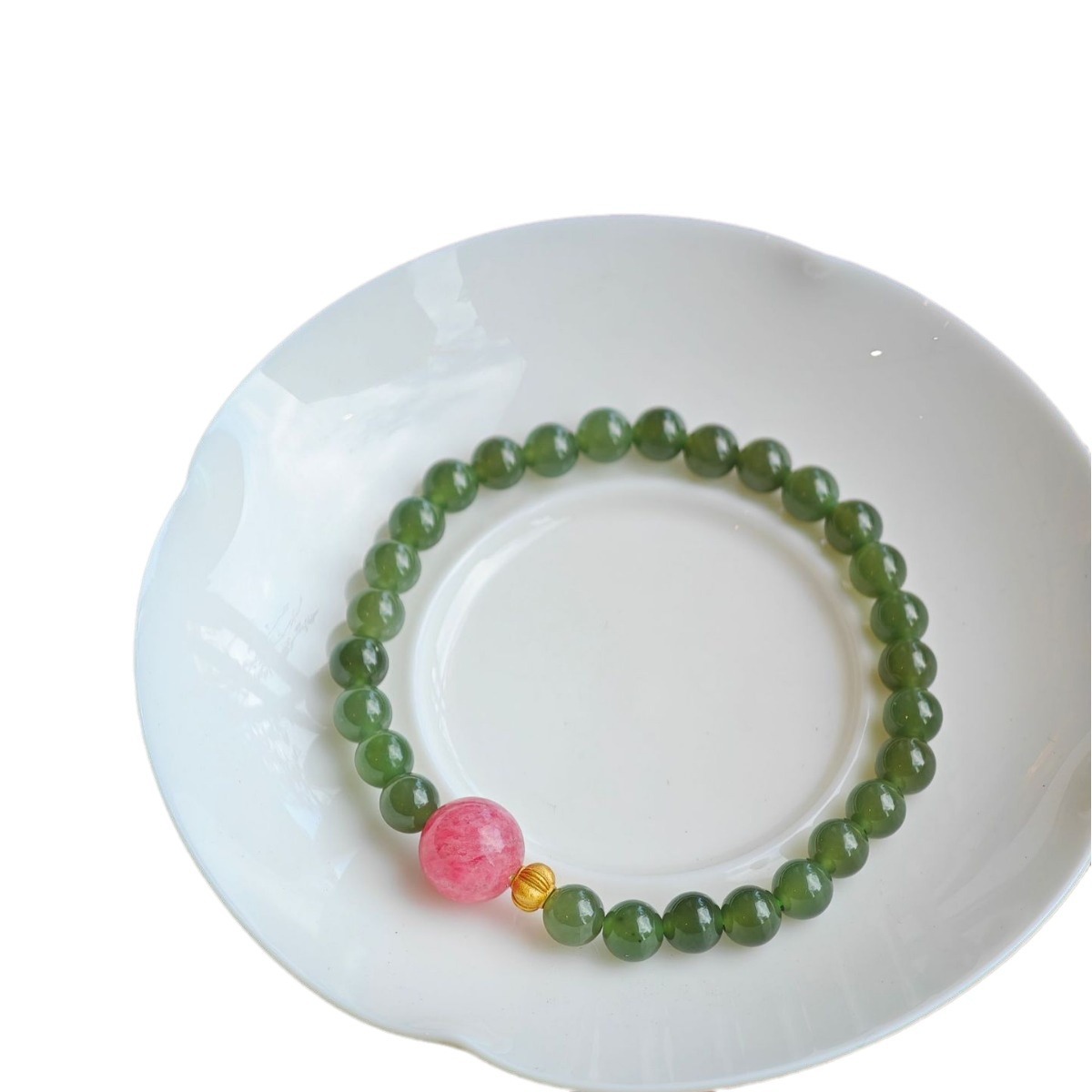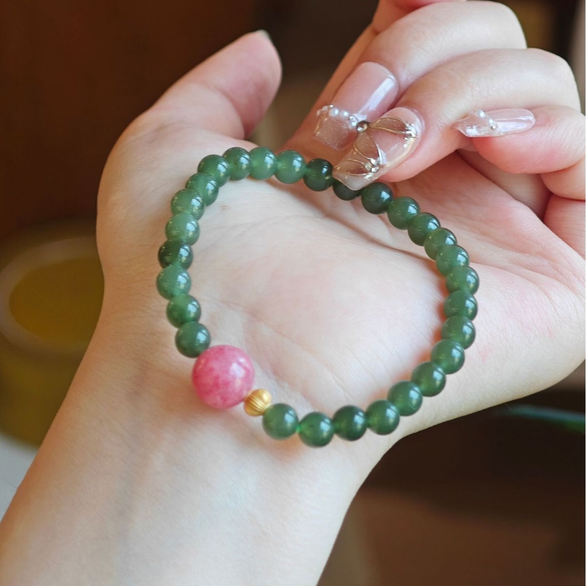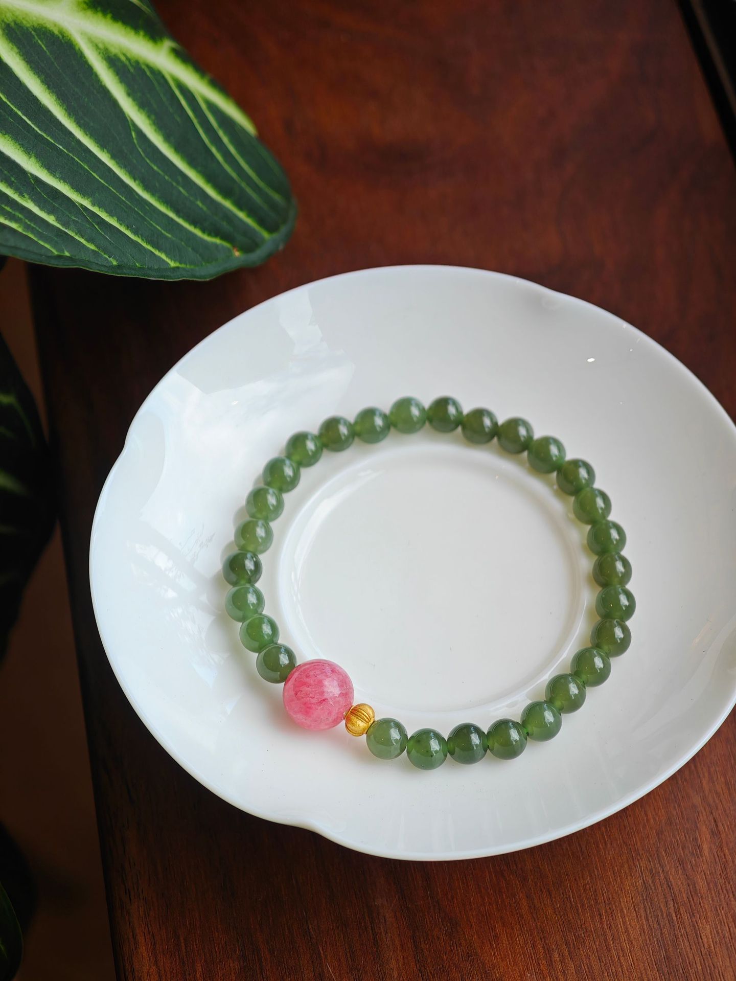 This image showcases the Jade & Rhodonite Bracelet, a delicate piece featuring green jade beads and a vibrant pink rhodonite accent, paired with a gold-toned detail. Set on a white textured plate with a lush green plant backdrop, the bracelet exudes (Oriental charm) and (light luxury) elegance, making it a standout accessory for those who appreciate traditional-inspired design.