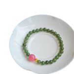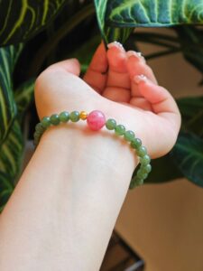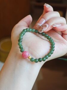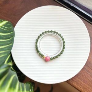 Set against a backdrop of lush green plants, this Jade & Rhodonite Bracelet emphasizes the natural beauty of its gemstones. The green jade beads harmonize with the plant’s foliage, while the pink rhodonite adds a vibrant contrast, creating a look that blends nature-inspired aesthetics with Oriental jewelry design.