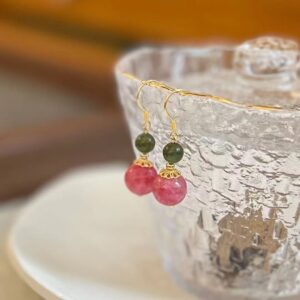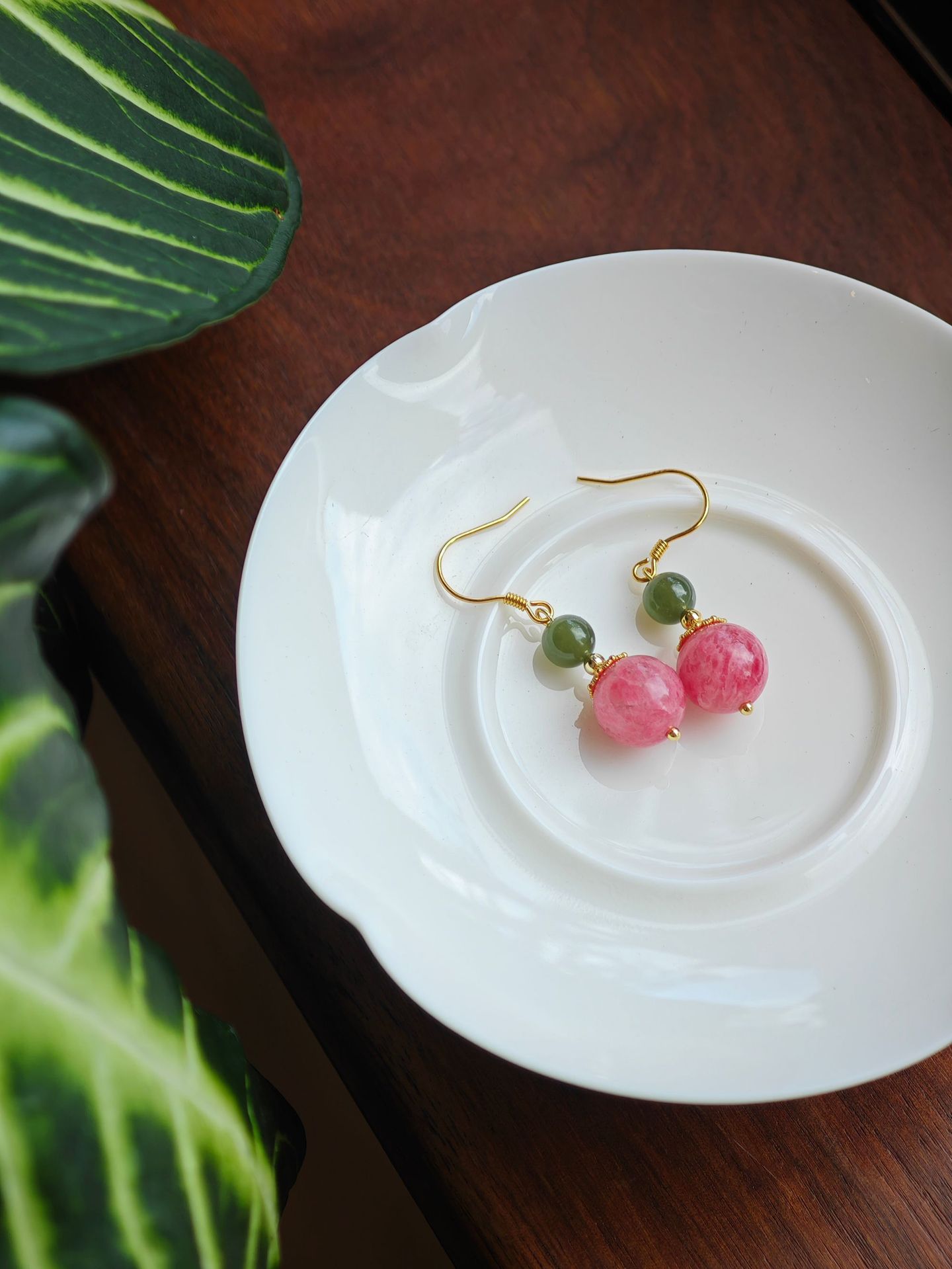 This close-up features the Jade & Rhodonite Earrings, a pair of drop earrings with green jade beads and pink rhodonite pendants, accented by gold-toned hooks and decorative elements. Displayed against a textured glass backdrop, the earrings highlight the contrast between the jade’s rich green and rhodonite’s vibrant pink, embodying a blend of Oriental aesthetics and modern craftsmanship.