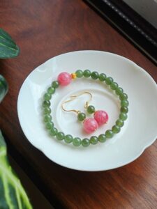 Displayed together on a white plate, this Jade & Rhodonite Jewelry Set includes a beaded bracelet and drop earrings, both featuring green jade and pink rhodonite with gold-toned accents. The coordinated design emphasizes the set’s cohesive Oriental style, making it an ideal choice for those seeking a matching ensemble with cultural and aesthetic depth.