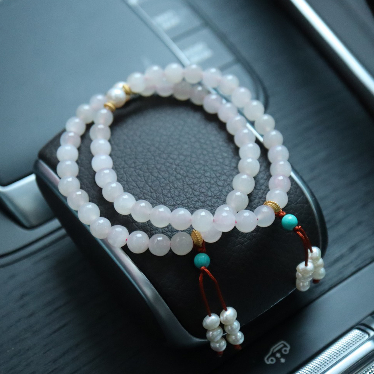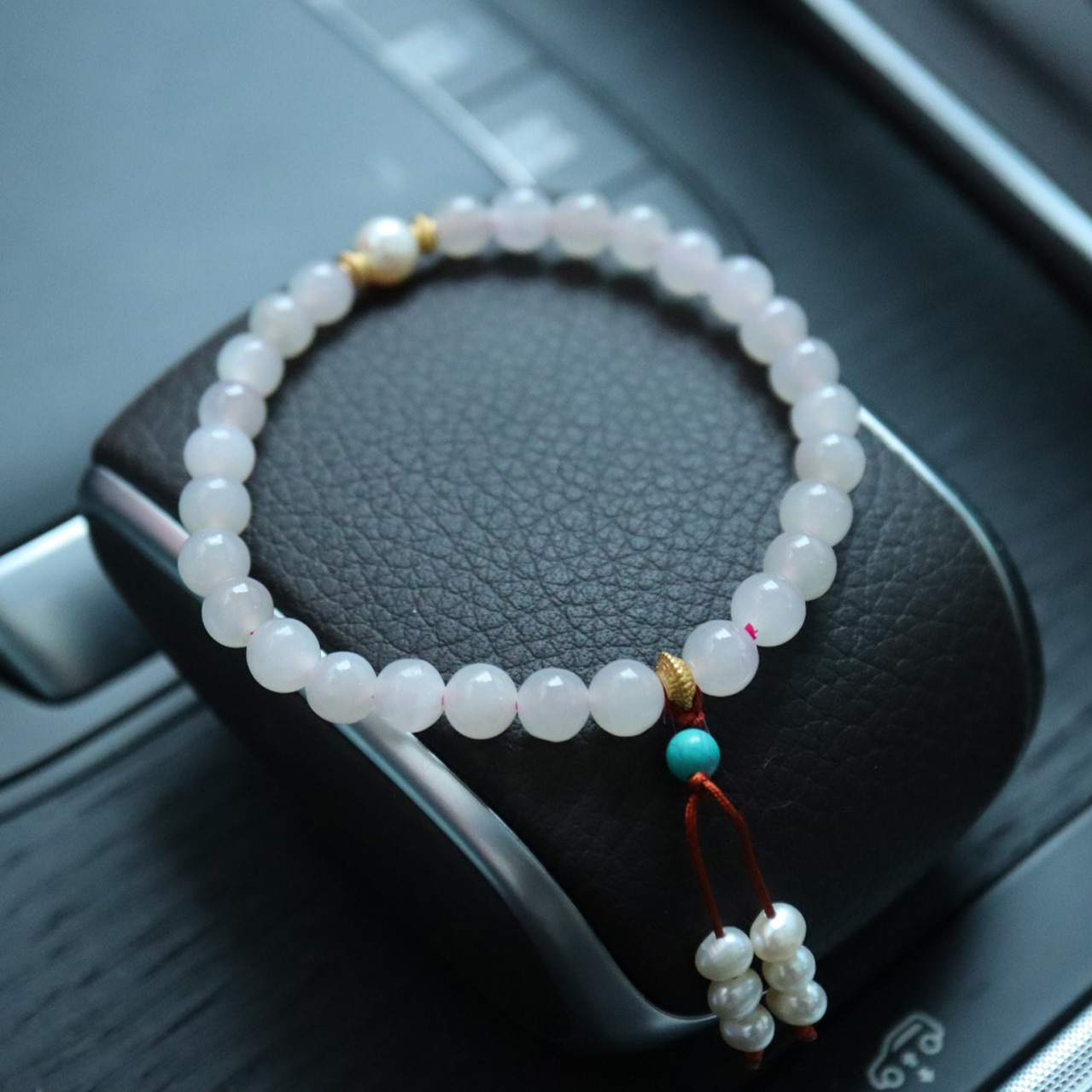 This image showcases the Lotus-Pink Hetian Jade Pearl Tassel Bracelet, a refined piece featuring soft pink Hetian jade beads, a freshwater pearl accent, and a turquoise-detail pearl tassel. Set against a sleek car interior backdrop, the bracelet highlights its (vintage charm) and elegant sophistication. The combination of jade, pearl, and turquoise creates a balanced look of traditional aesthetics and modern grace, making it an ideal accessory for those seeking a culture-inspired, (light luxury) piece.