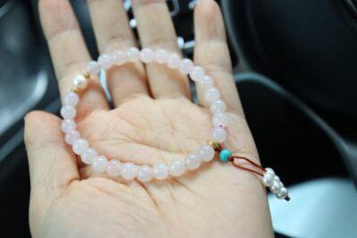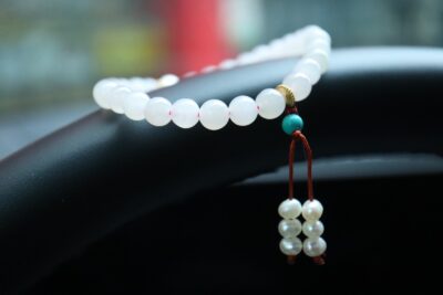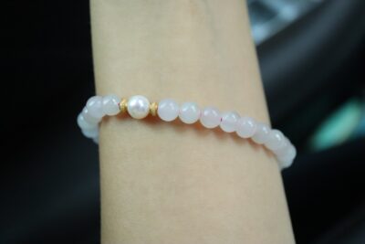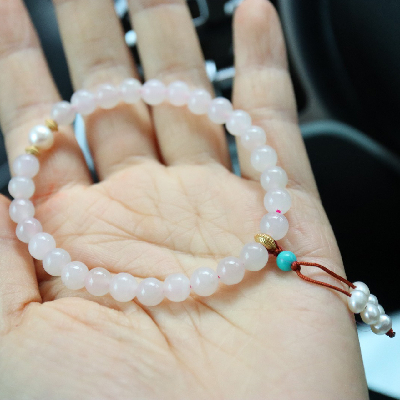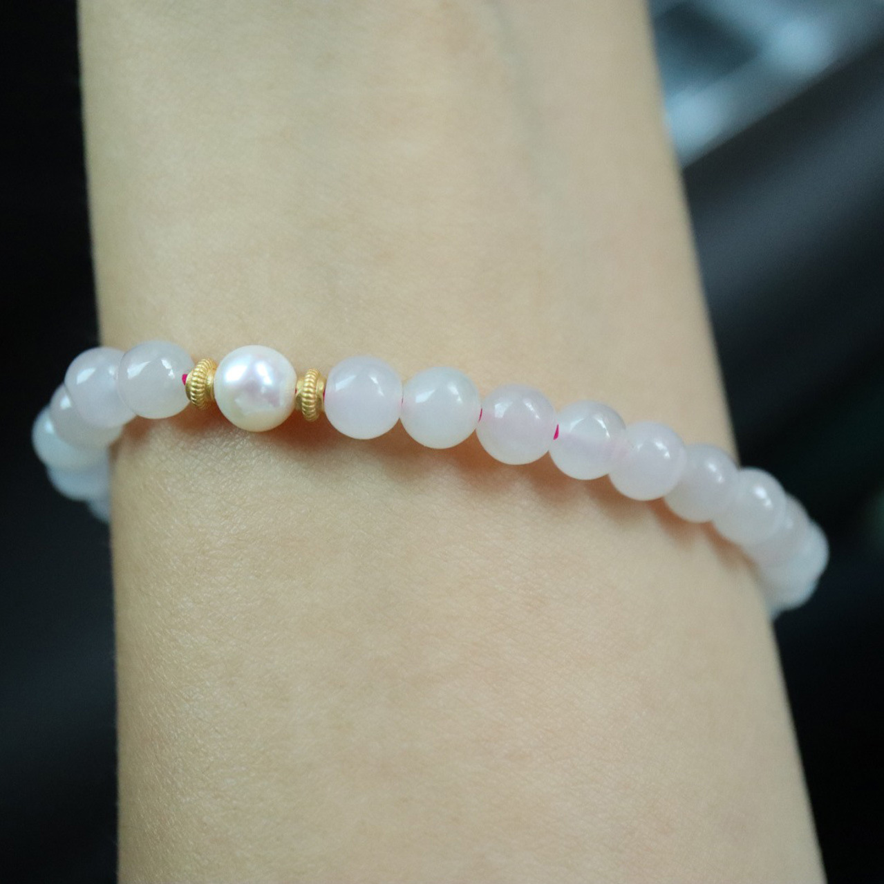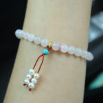This image showcases the Lotus-Pink Hetian Jade Pearl Tassel Bracelet, a delicate piece featuring soft pink Hetian jade beads, a turquoise accent, and a pearl tassel detail. Worn on a wrist, the bracelet exudes (vintage charm) and elegant sophistication, highlighted by the “Delicate pink” hue of the jade. The combination of jade, turquoise, and pearls creates a balanced look of traditional aesthetics and modern grace, making it an ideal accessory for those seeking a refined, culture-inspired piece.