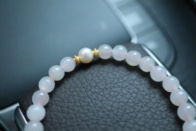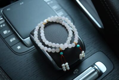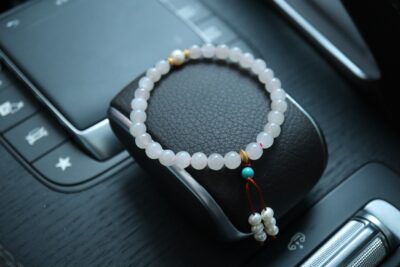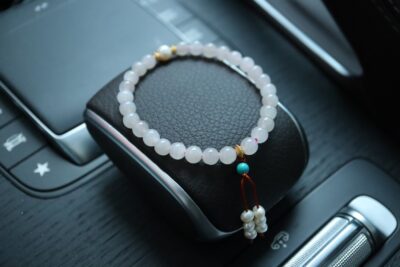 Set on a car interior surface, this Lotus-Pink Hetian Jade Pearl Tassel Bracelet showcases its elegant design. The soft pink jade beads, pearl tassel, and turquoise detail create a visually striking look, perfect for adding a touch of Oriental elegance to everyday styling.